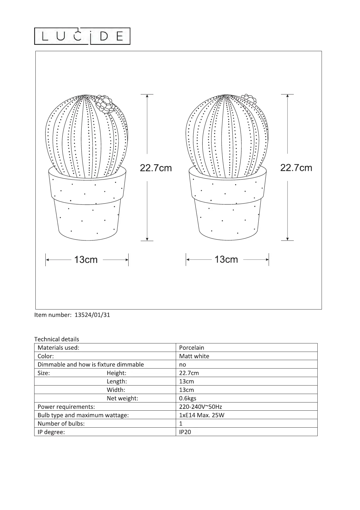 Lies die bedienungsanleitung für Lucide Cactus 13524/01/31 (3 Seiten) kostenlos online; sie gehört zur Kategorie Beleuchtung. Dieses Handbuch wurde von 12 Personen als hilfreich bewertet und erhielt im Schnitt 5.0 Sterne aus 6 Bewertungen. Hast du eine Frage zu Lucide Cactus 13524/01/31 oder möchtest du andere Nutzer dieses Produkts befragen? Stelle eine Frage