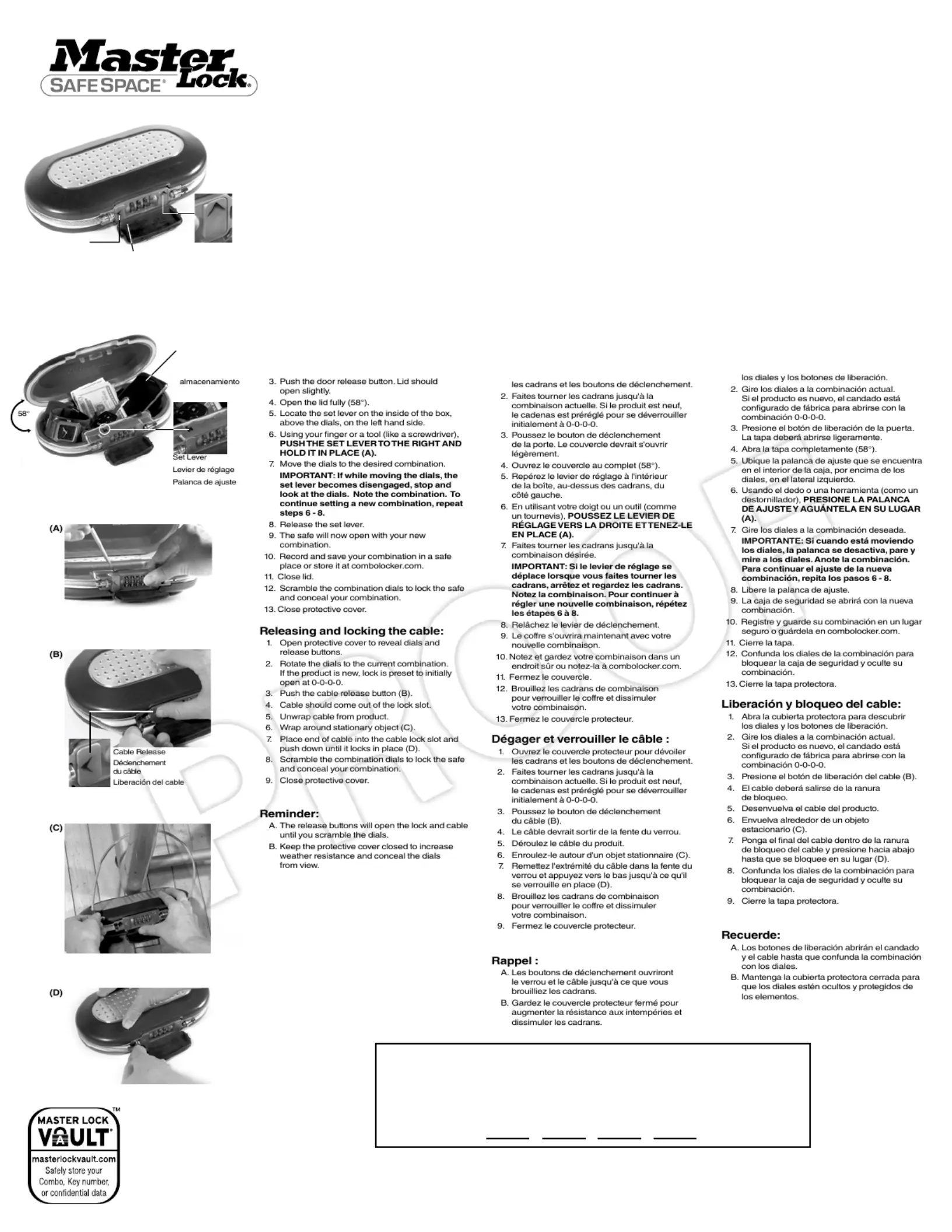 Cerciórese de registrar su combinación. Almacene en un lugar seguro.