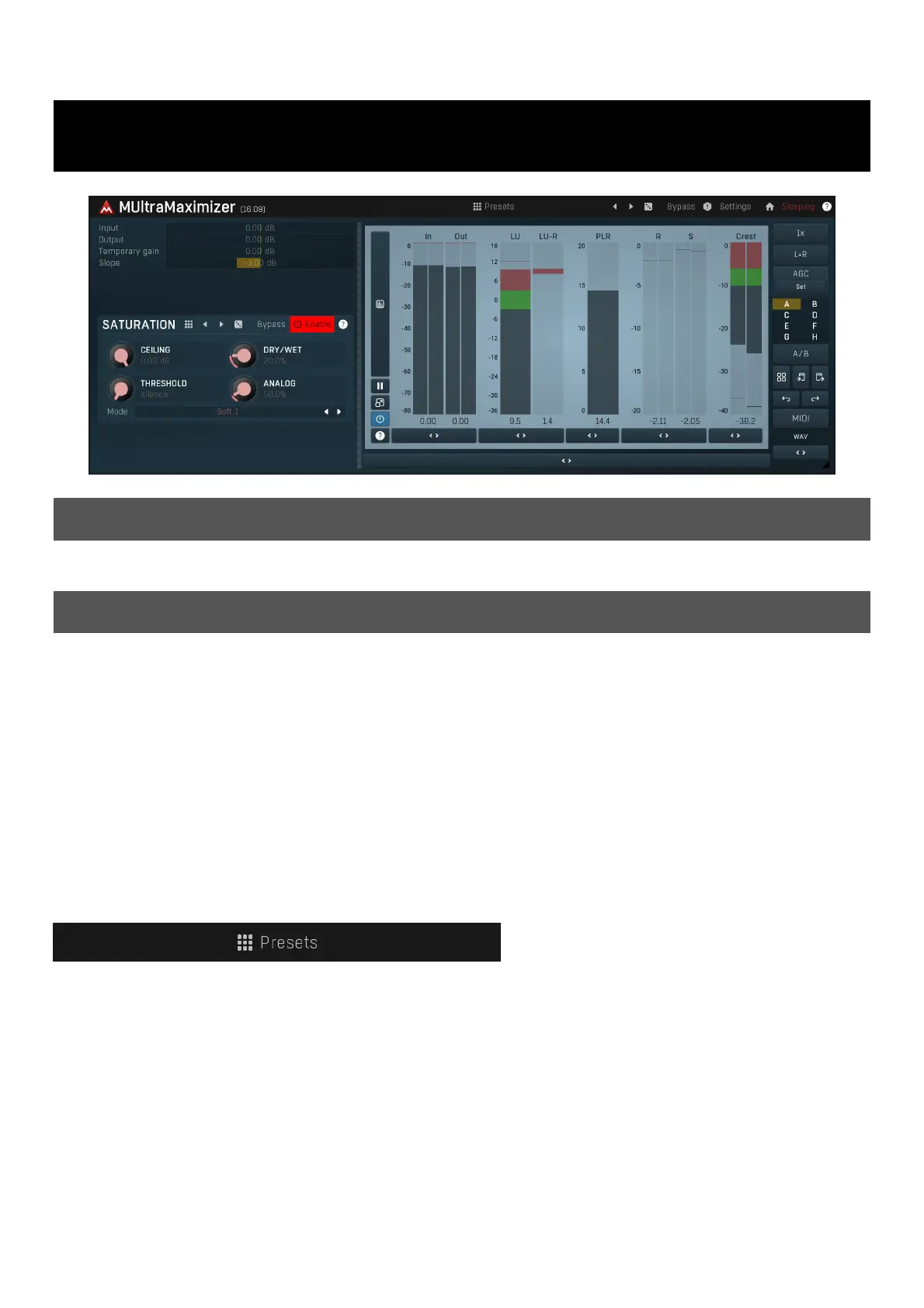 Saturation panel contains the parameters of the saturator used on the output signal, and ensures there will be no peaks above 0dB. This