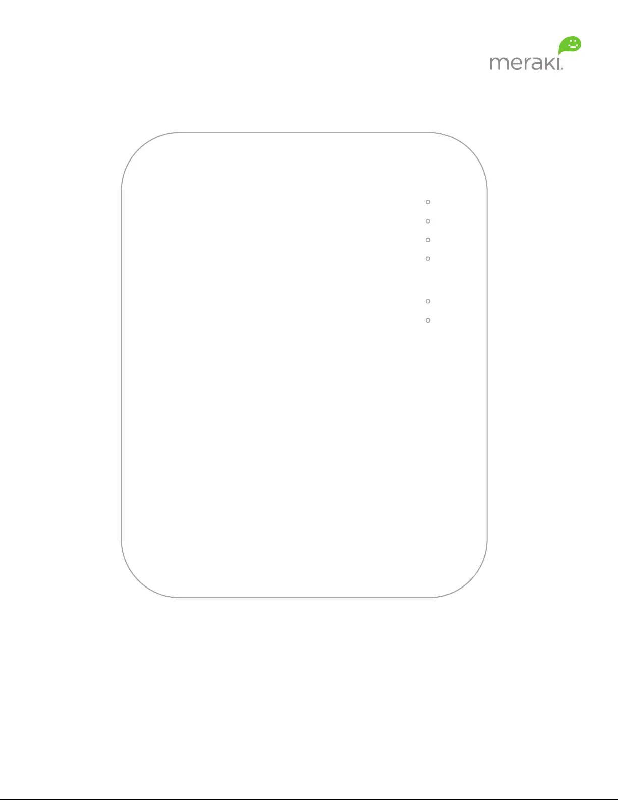 Lies die bedienungsanleitung für Meraki MR24 (35 Seiten) kostenlos online; sie gehört zur Kategorie Zugangspunkt. Dieses Handbuch wurde von 17 Personen als hilfreich bewertet und erhielt im Schnitt 4.8 Sterne aus 9 Bewertungen. Hast du eine Frage zu Meraki MR24 oder möchtest du andere Nutzer dieses Produkts befragen? Stelle eine Frage