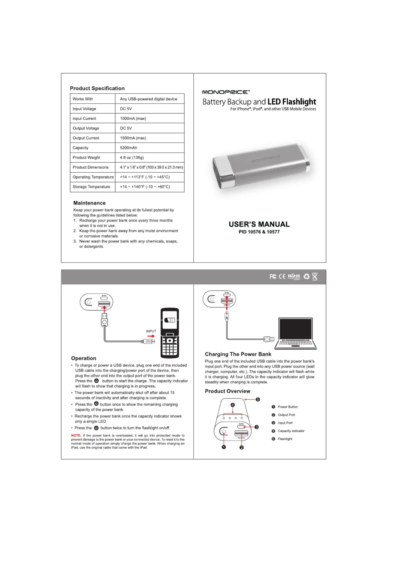 Lies die bedienungsanleitung für Monoprice PID 10577 (1 Seiten) kostenlos online; sie gehört zur Kategorie Mobile Ladegeräte. Dieses Handbuch wurde von 39 Personen als hilfreich bewertet und erhielt im Schnitt 4.4 Sterne aus 4 Bewertungen. Hast du eine Frage zu Monoprice PID 10577 oder möchtest du andere Nutzer dieses Produkts befragen? Stelle eine Frage
