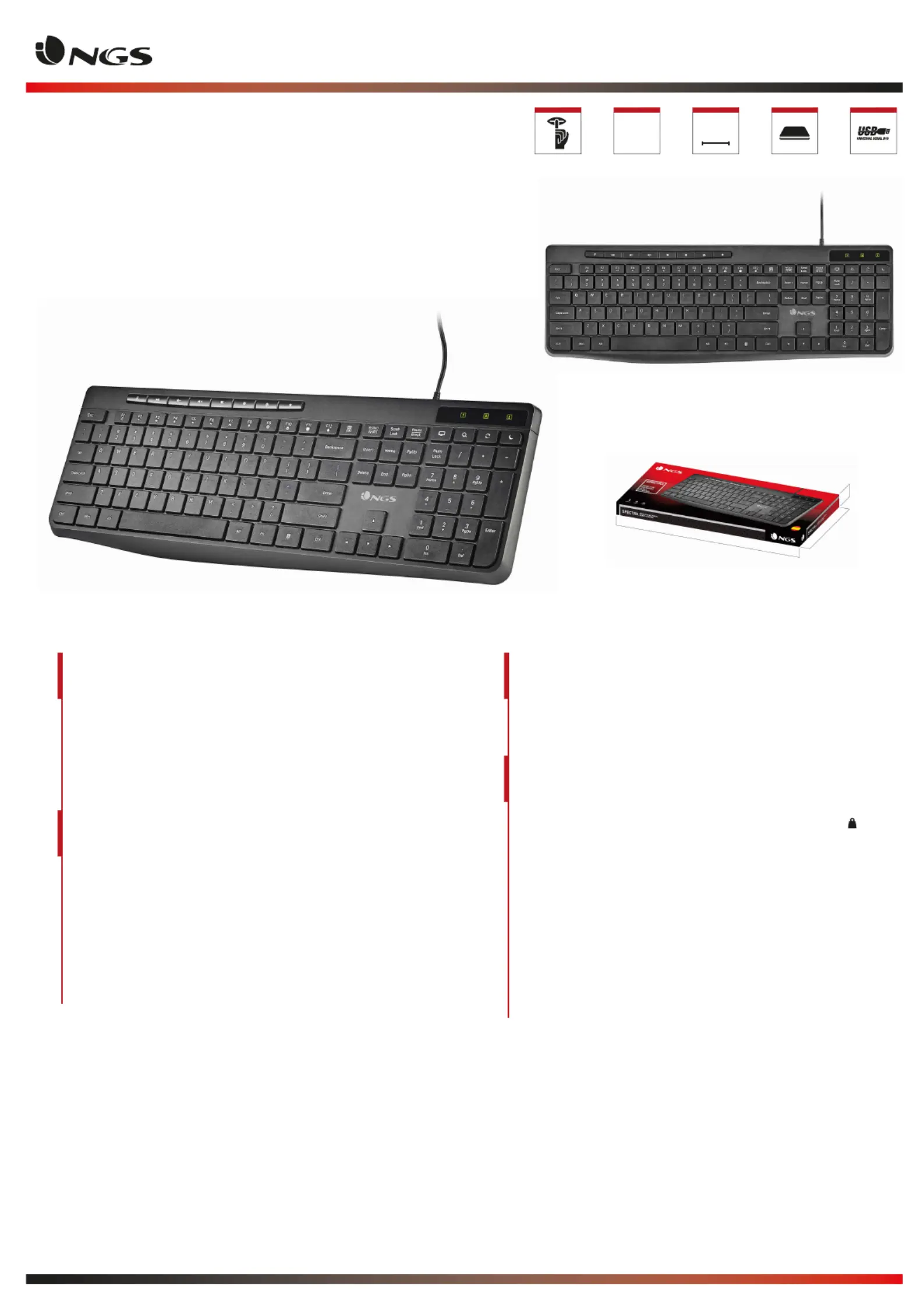 Lies die bedienungsanleitung für NGS Spectra (1 Seiten) kostenlos online; sie gehört zur Kategorie Tastatur. Dieses Handbuch wurde von 45 Personen als hilfreich bewertet und erhielt im Schnitt 4.8 Sterne aus 9 Bewertungen. Hast du eine Frage zu NGS Spectra oder möchtest du andere Nutzer dieses Produkts befragen? Stelle eine Frage