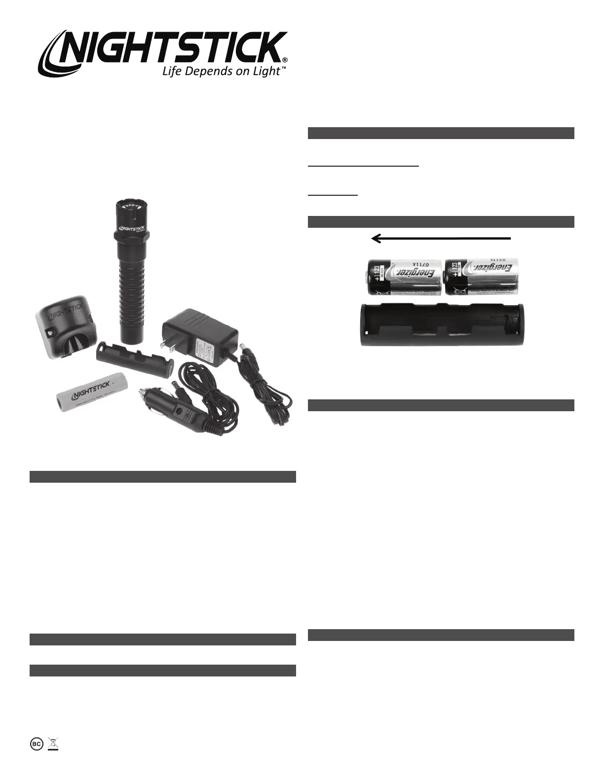 yUse only the supplied Nightstick charger, battery and AC or DC adapter. For best