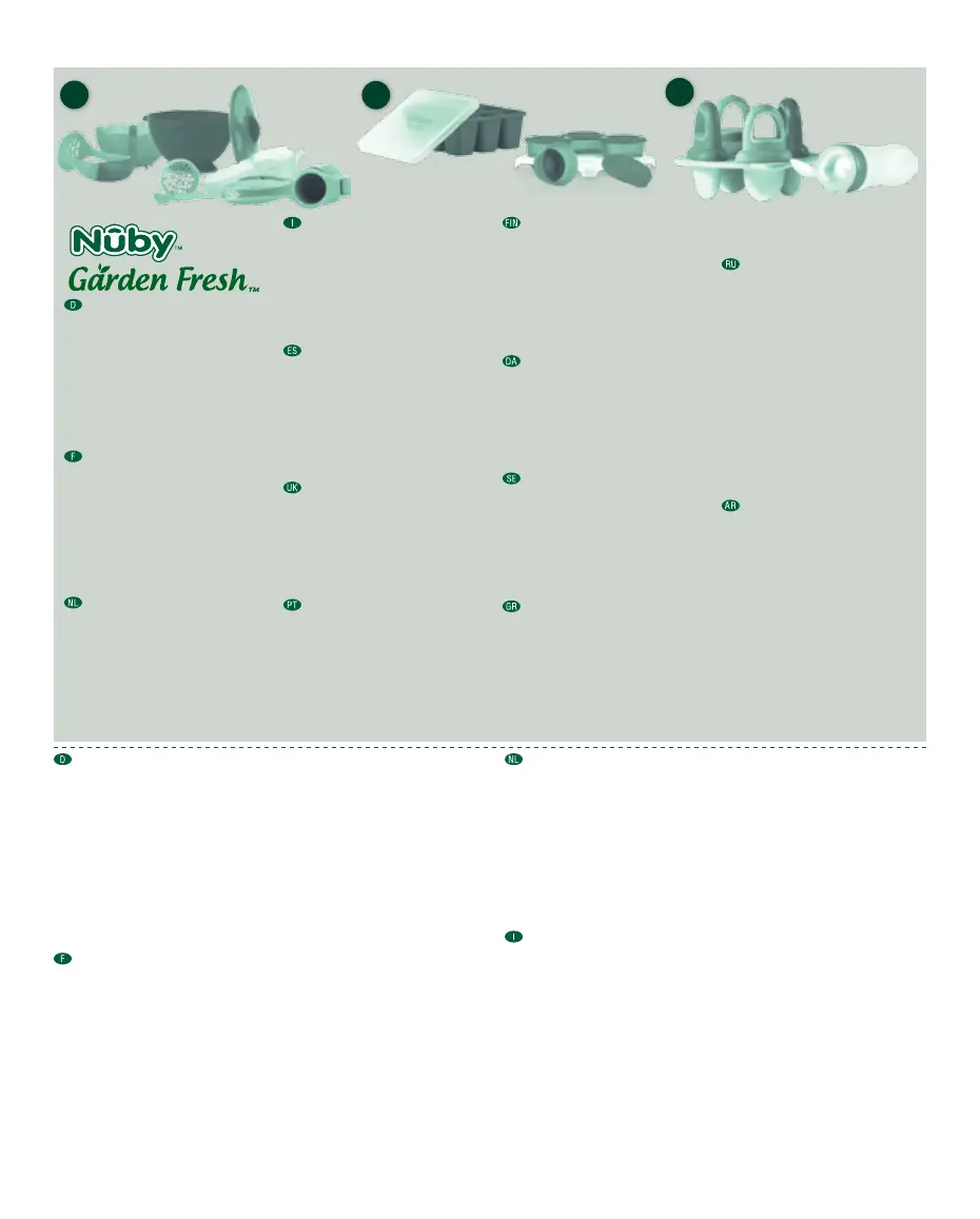 voor en meteen na elk gebruik. GEBRUIK: Vul de vakjes met verse puree, moedermelk of sap