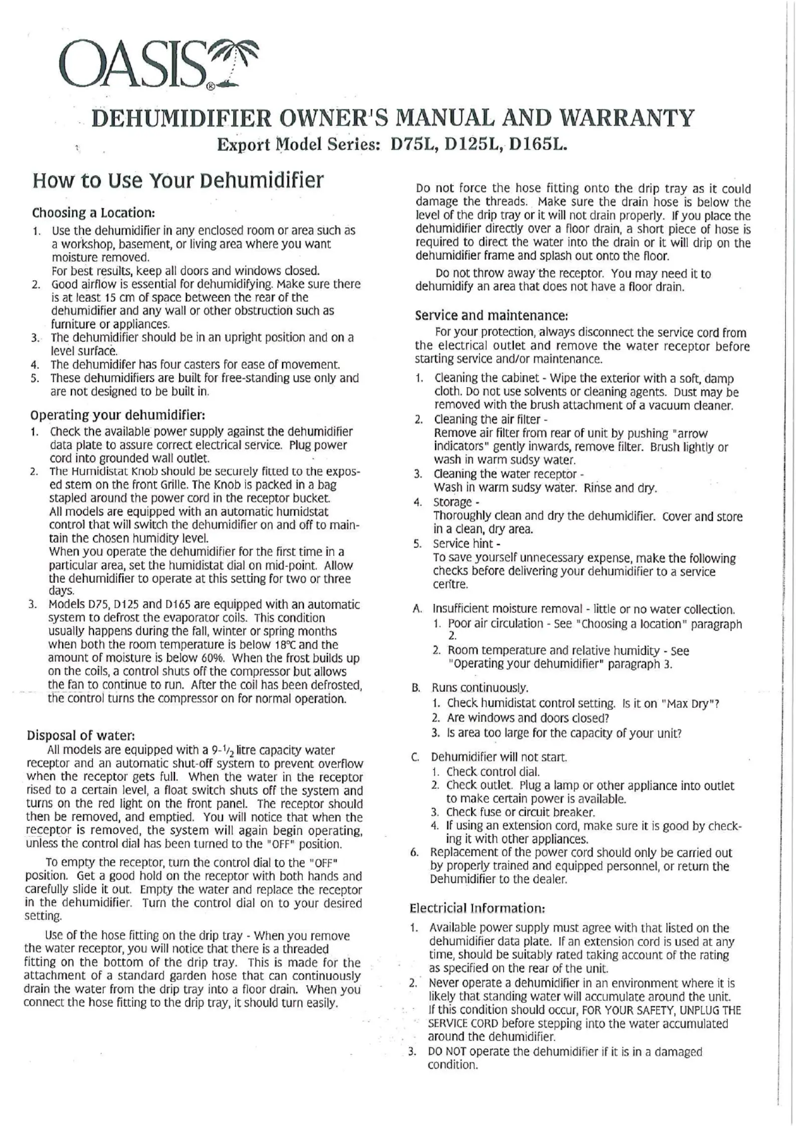 Lies die bedienungsanleitung für Oasis D165L (2 Seiten) kostenlos online; sie gehört zur Kategorie Luftentfeuchter. Dieses Handbuch wurde von 22 Personen als hilfreich bewertet und erhielt im Schnitt 4.6 Sterne aus 11.5 Bewertungen. Hast du eine Frage zu Oasis D165L oder möchtest du andere Nutzer dieses Produkts befragen? Stelle eine Frage