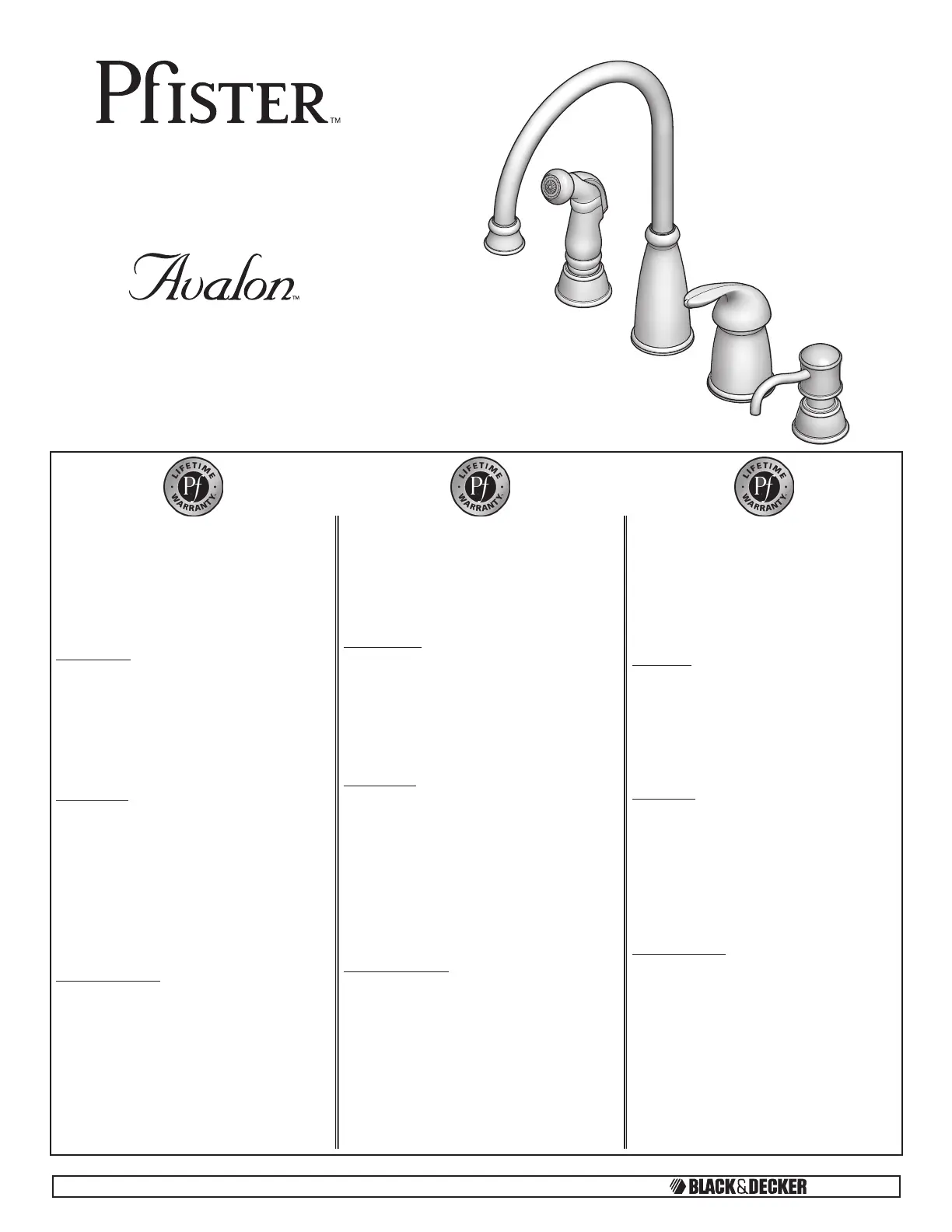 Lies die bedienungsanleitung für Pfister Avalon GT26-4C (18 Seiten) kostenlos online; sie gehört zur Kategorie Wasserhahn. Dieses Handbuch wurde von 4 Personen als hilfreich bewertet und erhielt im Schnitt 4.1 Sterne aus 6 Bewertungen. Hast du eine Frage zu Pfister Avalon GT26-4C oder möchtest du andere Nutzer dieses Produkts befragen? Stelle eine Frage
