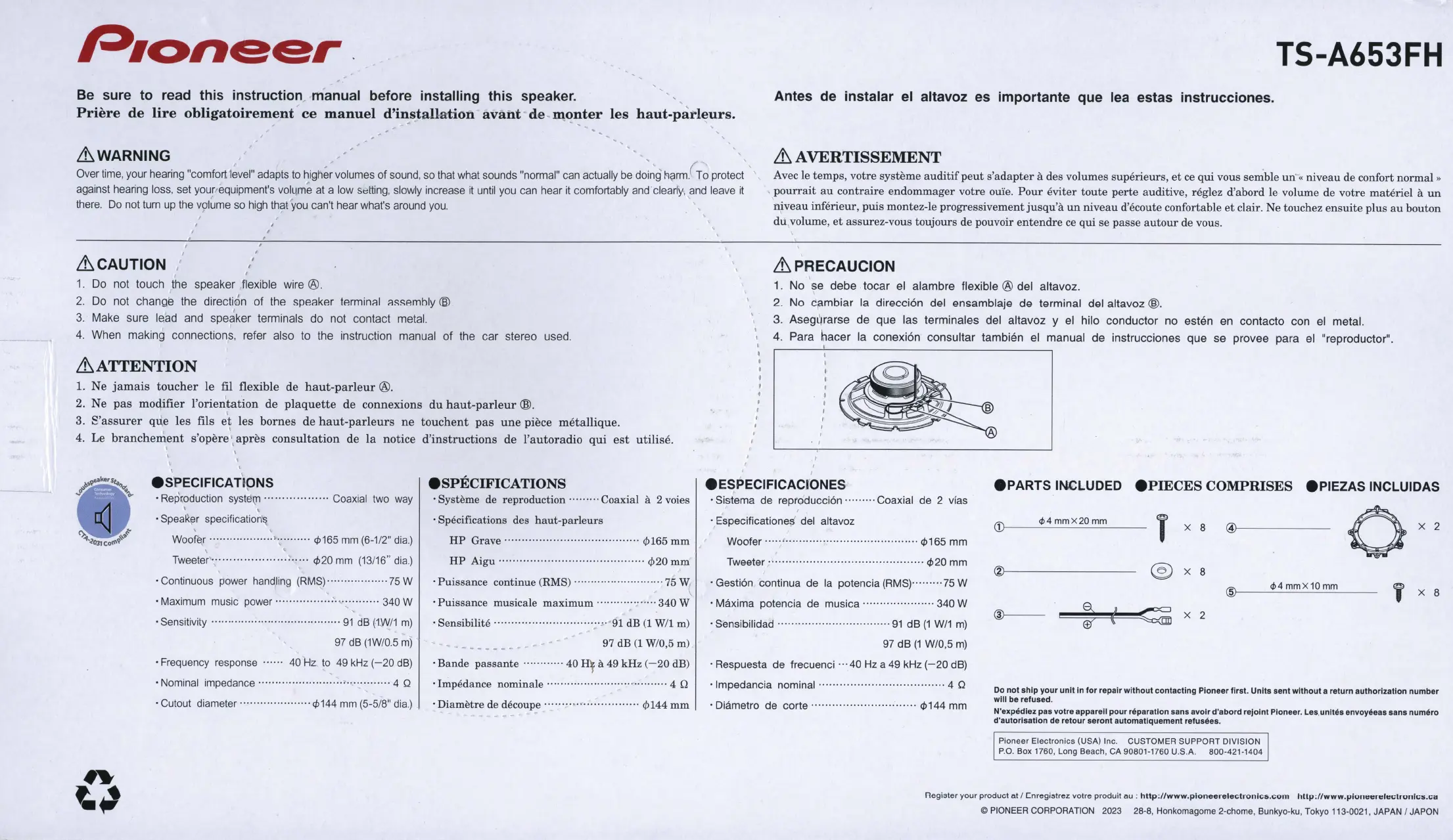 Lies die bedienungsanleitung für Pioneer TS-A653FH (4 Seiten) kostenlos online; sie gehört zur Kategorie Lautsprecher. Dieses Handbuch wurde von 5 Personen als hilfreich bewertet und erhielt im Schnitt 4.9 Sterne aus 3 Bewertungen. Hast du eine Frage zu Pioneer TS-A653FH oder möchtest du andere Nutzer dieses Produkts befragen? Stelle eine Frage