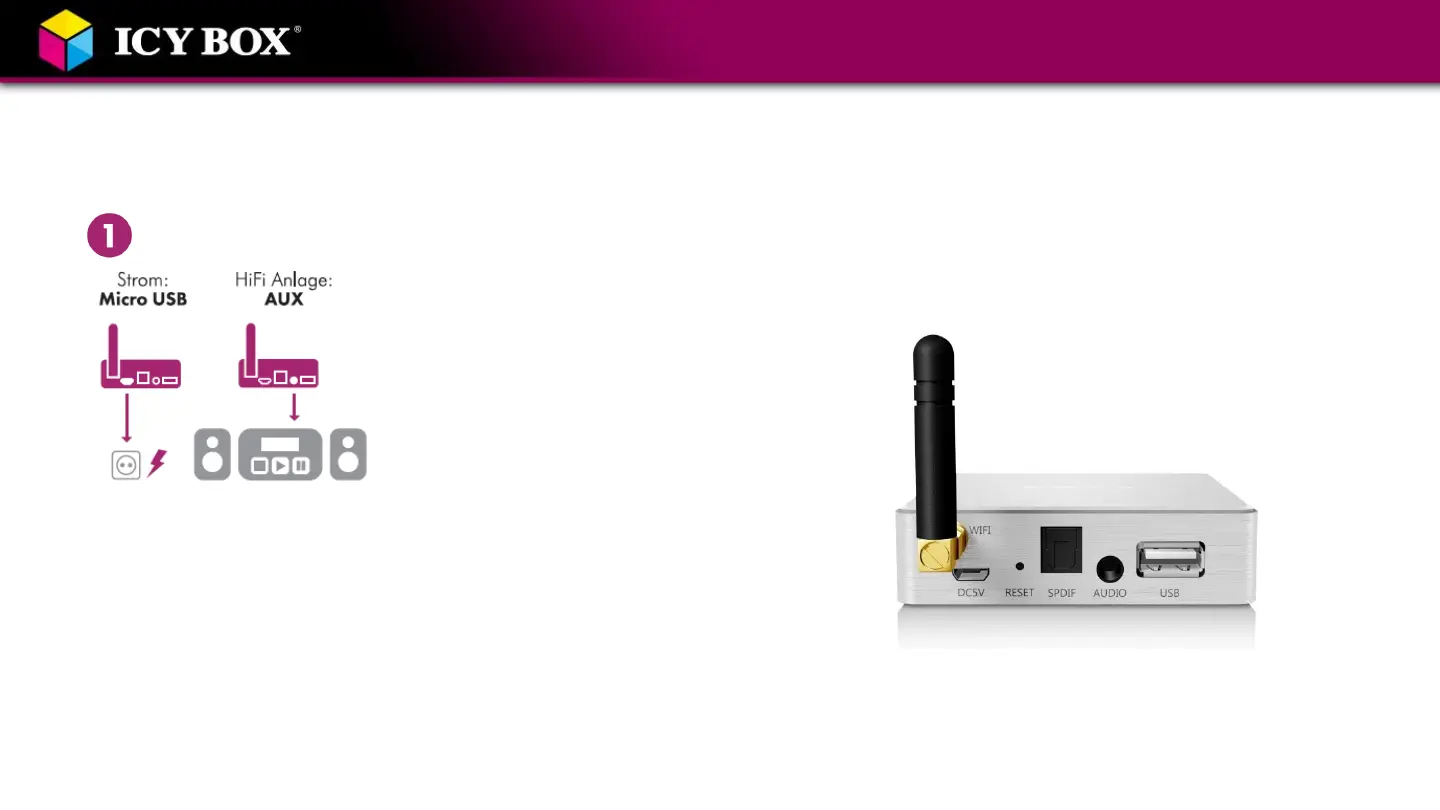 -Die Stereoanlage und der IB-MP401Air werden mithilfe eines AUX oder optischen Kabels verbunden.