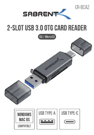 Lies die bedienungsanleitung für Sabrent CR-BCA2 (4 Seiten) kostenlos online; sie gehört zur Kategorie Speicherkartenleser. Dieses Handbuch wurde von 23 Personen als hilfreich bewertet und erhielt im Schnitt 4.6 Sterne aus 8 Bewertungen. Hast du eine Frage zu Sabrent CR-BCA2 oder möchtest du andere Nutzer dieses Produkts befragen? Stelle eine Frage