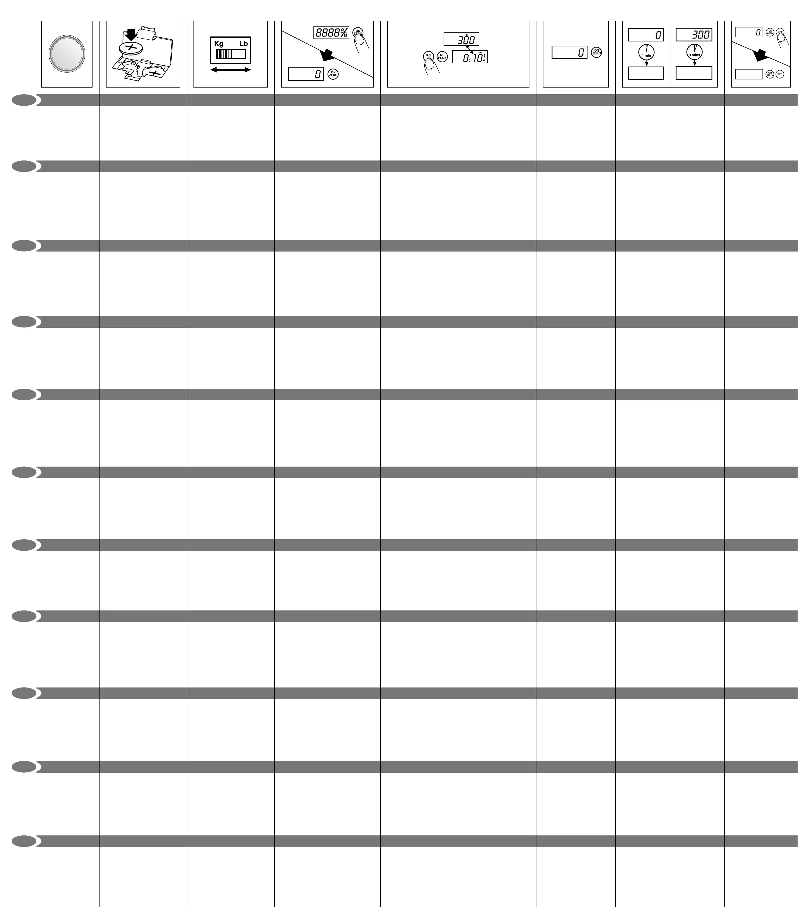 ML/FLOZ button to switch to measure liquid measures (‘ml’ or ‘fl.oz’).To return to