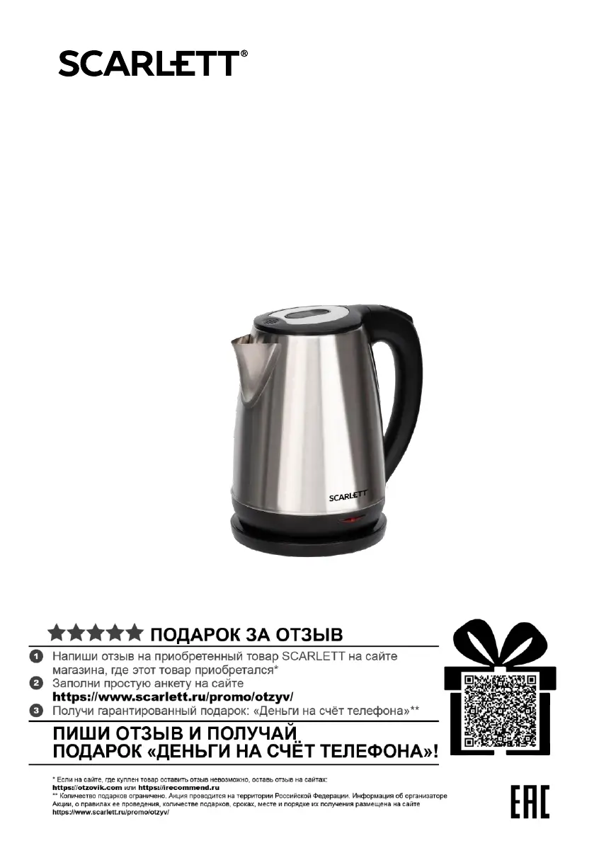 Lies die bedienungsanleitung für Scarlett SC-EK21S34 (16 Seiten) kostenlos online; sie gehört zur Kategorie Wasserkocher. Dieses Handbuch wurde von 17 Personen als hilfreich bewertet und erhielt im Schnitt 5.0 Sterne aus 8 Bewertungen. Hast du eine Frage zu Scarlett SC-EK21S34 oder möchtest du andere Nutzer dieses Produkts befragen? Stelle eine Frage