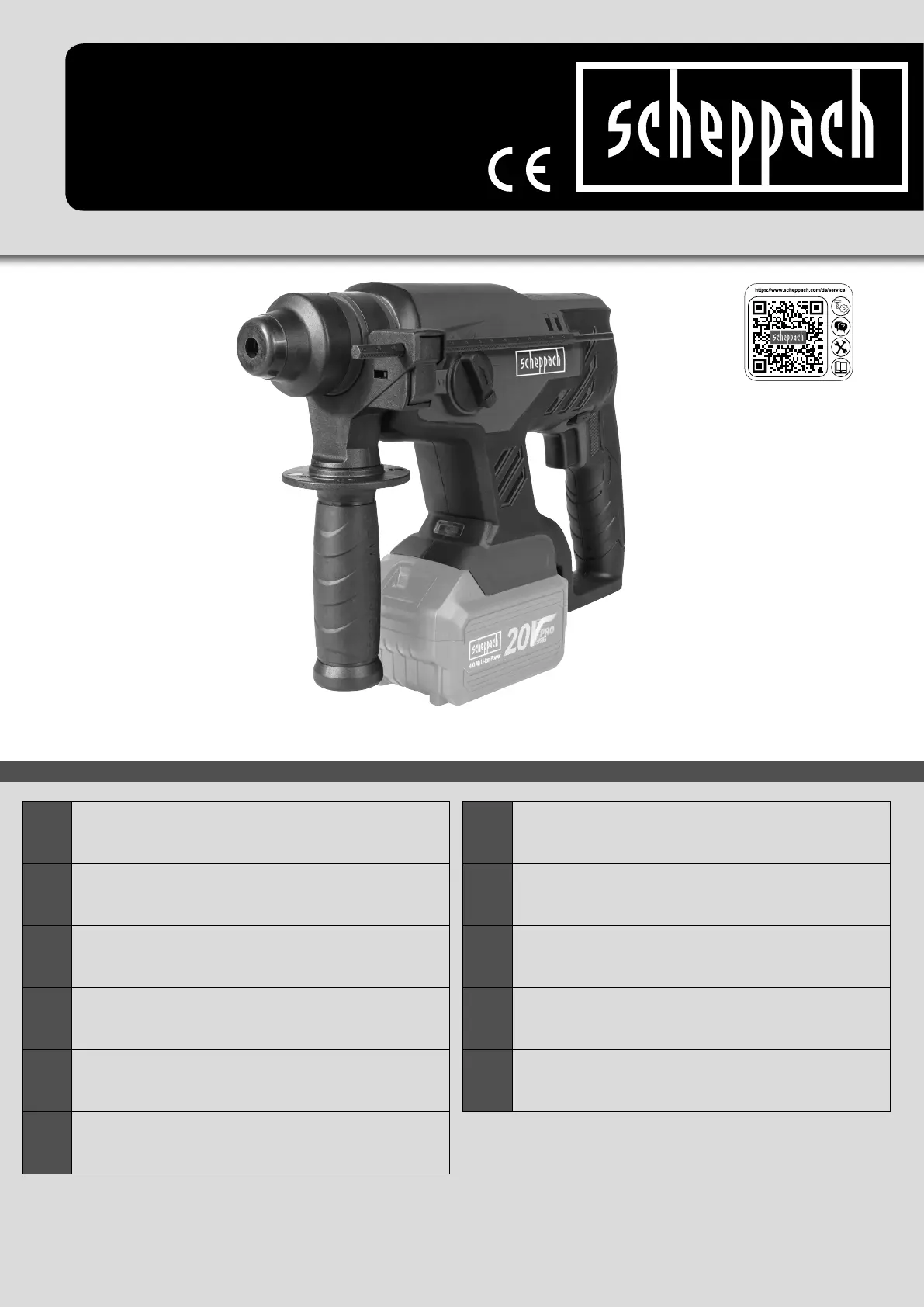 Lies die bedienungsanleitung für Scheppach BCRH170-20ProS (116 Seiten) kostenlos online; sie gehört zur Kategorie Bohrhämmer. Dieses Handbuch wurde von 31 Personen als hilfreich bewertet und erhielt im Schnitt 4.4 Sterne aus 16 Bewertungen. Hast du eine Frage zu Scheppach BCRH170-20ProS oder möchtest du andere Nutzer dieses Produkts befragen? Stelle eine Frage