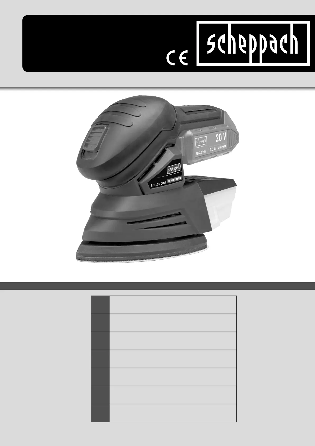 Lies die bedienungsanleitung für Scheppach CFS135-20Li (76 Seiten) kostenlos online; sie gehört zur Kategorie Schleifmaschine. Dieses Handbuch wurde von 11 Personen als hilfreich bewertet und erhielt im Schnitt 4.3 Sterne aus 6 Bewertungen. Hast du eine Frage zu Scheppach CFS135-20Li oder möchtest du andere Nutzer dieses Produkts befragen? Stelle eine Frage