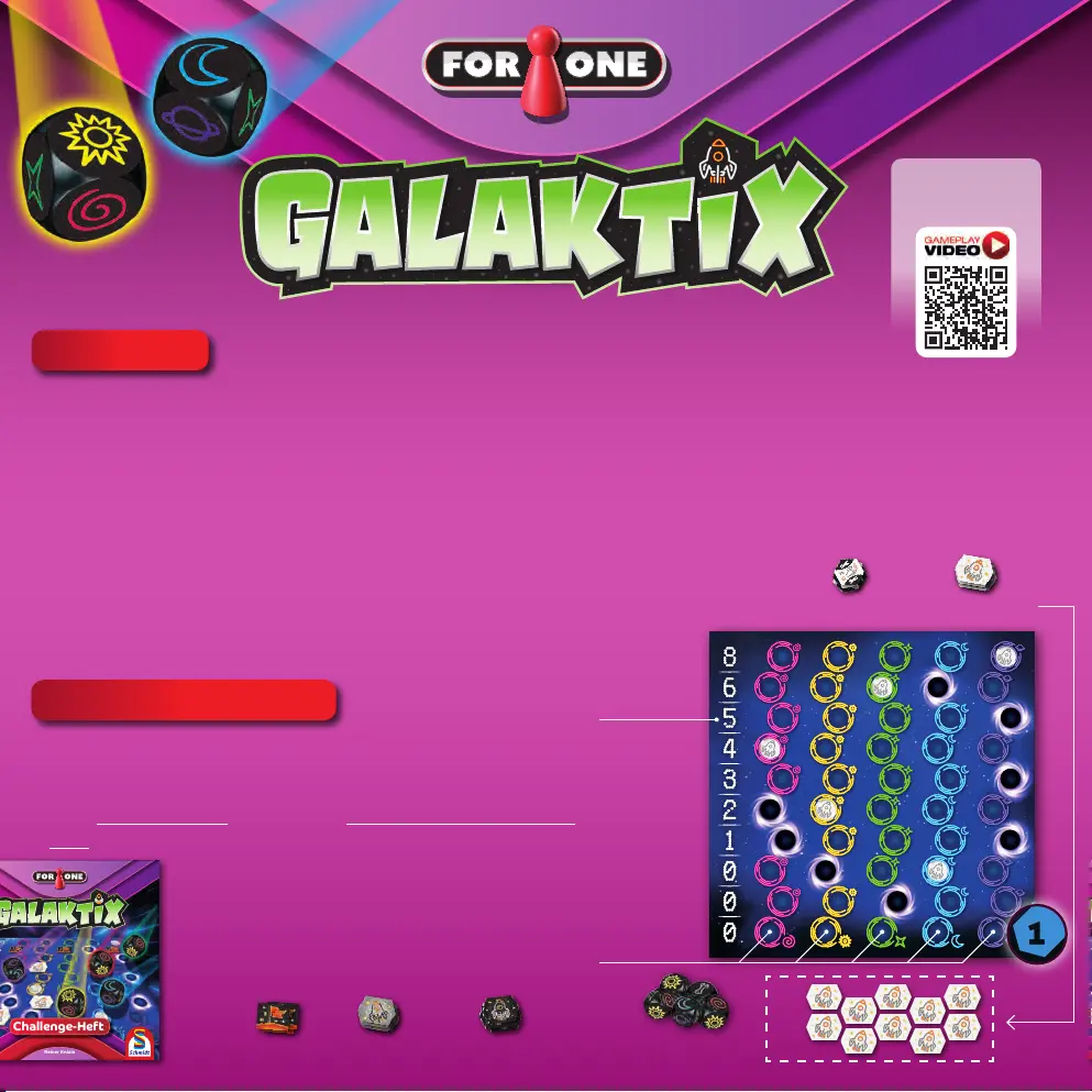 For One – Galaktix stellt dich allein immer wieder aufs Neue vor interessante Entscheidungen! Mit Spacewürfeln versuchst du, deine