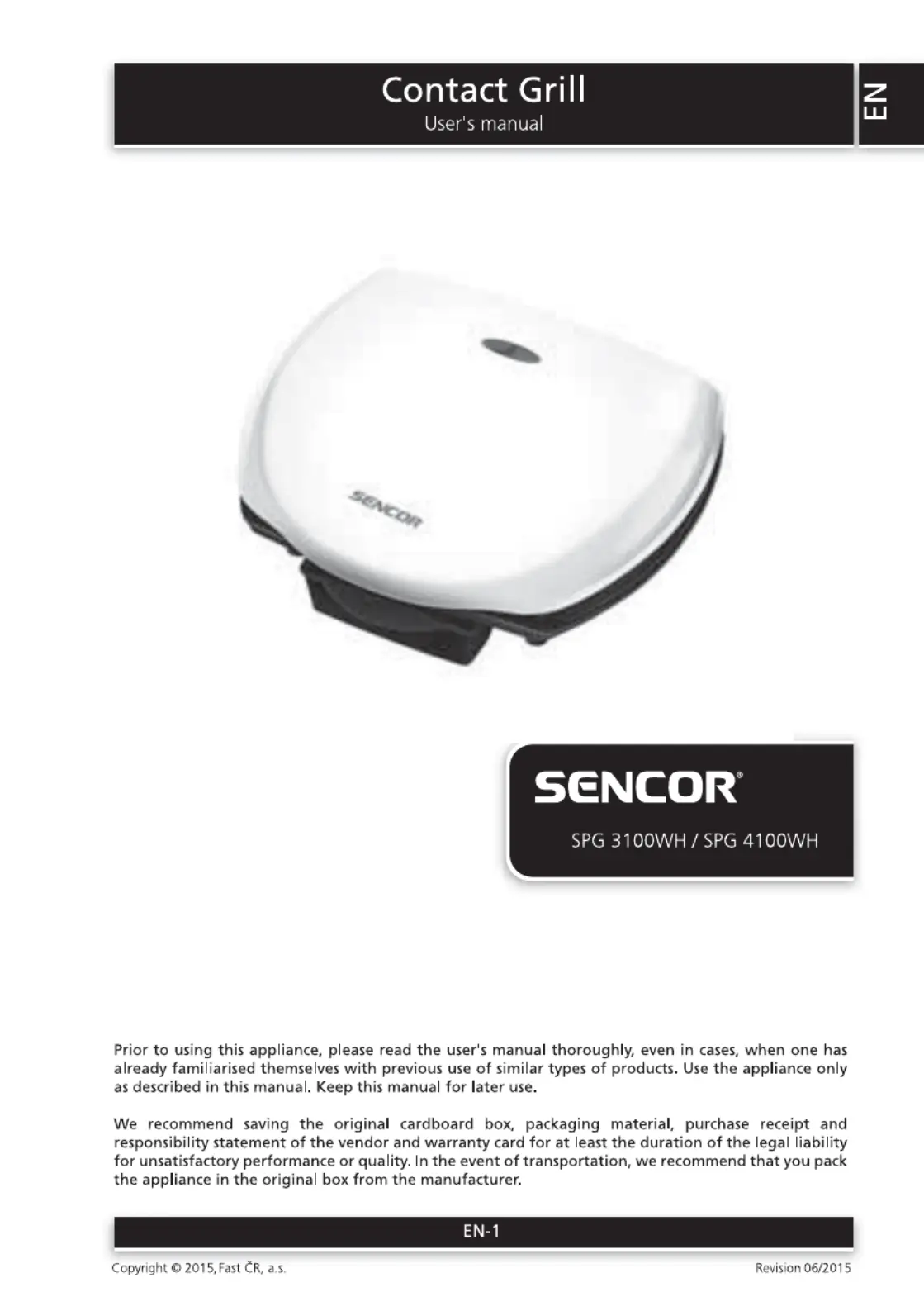 Lies die bedienungsanleitung für Sencor SPG 4100WH (10 Seiten) kostenlos online; sie gehört zur Kategorie Mit einem Toast. Dieses Handbuch wurde von 35 Personen als hilfreich bewertet und erhielt im Schnitt 5.0 Sterne aus 3 Bewertungen. Hast du eine Frage zu Sencor SPG 4100WH oder möchtest du andere Nutzer dieses Produkts befragen? Stelle eine Frage
