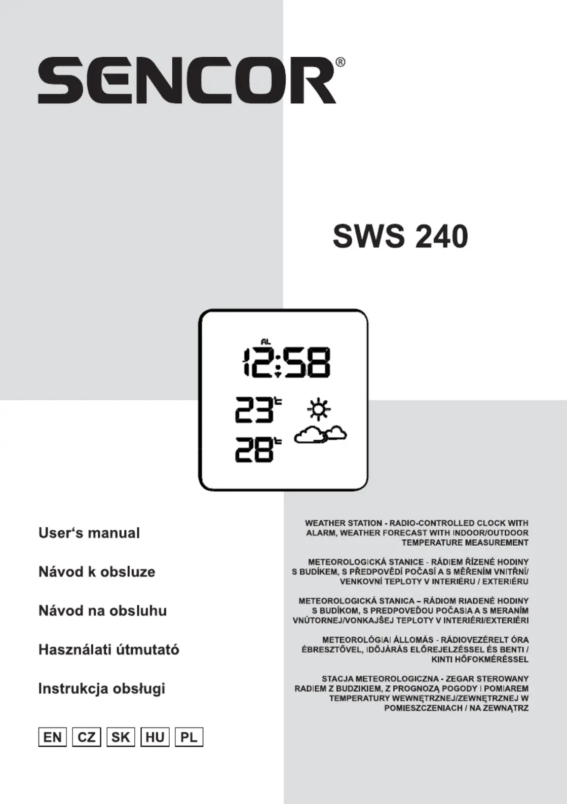 Lies die bedienungsanleitung für Sencor SWS 240 OR (7 Seiten) kostenlos online; sie gehört zur Kategorie Wetterstation. Dieses Handbuch wurde von 35 Personen als hilfreich bewertet und erhielt im Schnitt 4.3 Sterne aus 6 Bewertungen. Hast du eine Frage zu Sencor SWS 240 OR oder möchtest du andere Nutzer dieses Produkts befragen? Stelle eine Frage