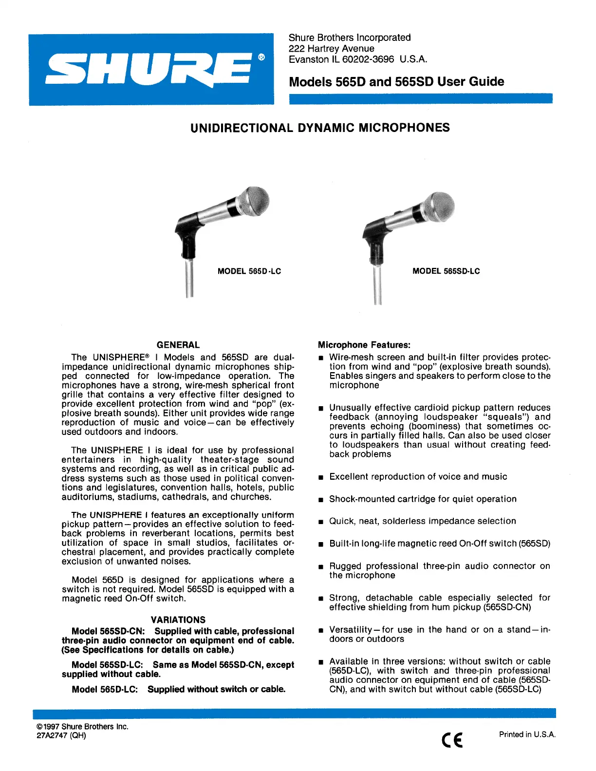 Lies die bedienungsanleitung für Shure 565SD-LC (3 Seiten) kostenlos online; sie gehört zur Kategorie Mikrofon. Dieses Handbuch wurde von 2 Personen als hilfreich bewertet und erhielt im Schnitt 4.5 Sterne aus 9 Bewertungen. Hast du eine Frage zu Shure 565SD-LC oder möchtest du andere Nutzer dieses Produkts befragen? Stelle eine Frage