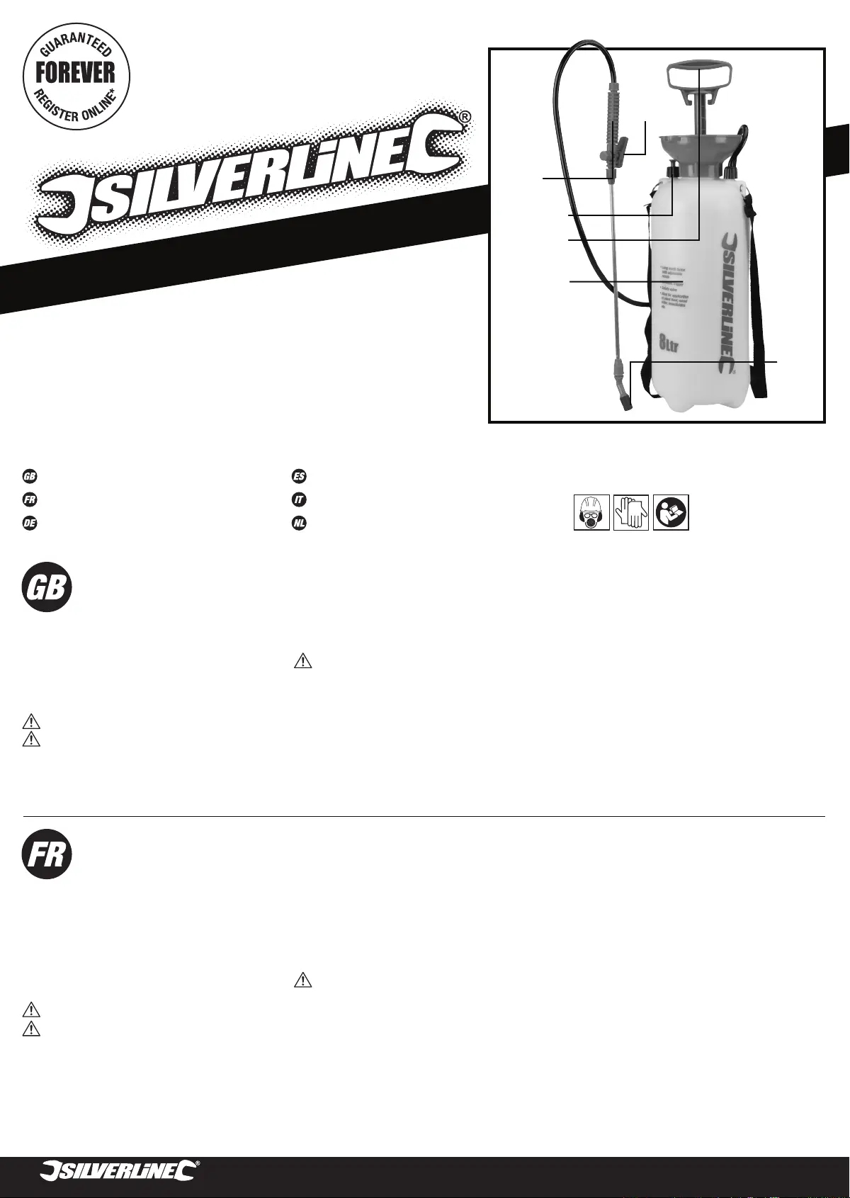 • Pour the liquid to be sprayed into the Tank (1). Do not fill above the maximum level (8Ltr)