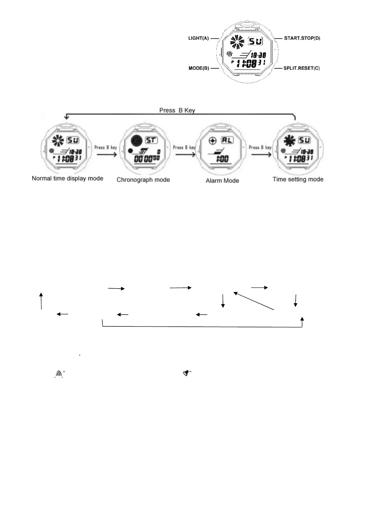 In normal display mode: press B key once, enter Chronograph mode
