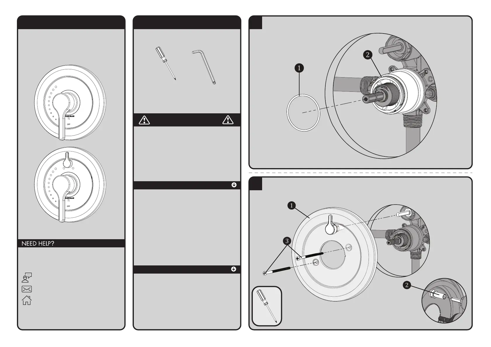 Verify that the Valve is in the “OFF” position. Install the Wall Plate ❶ to the Valve. If installing a Diverter
