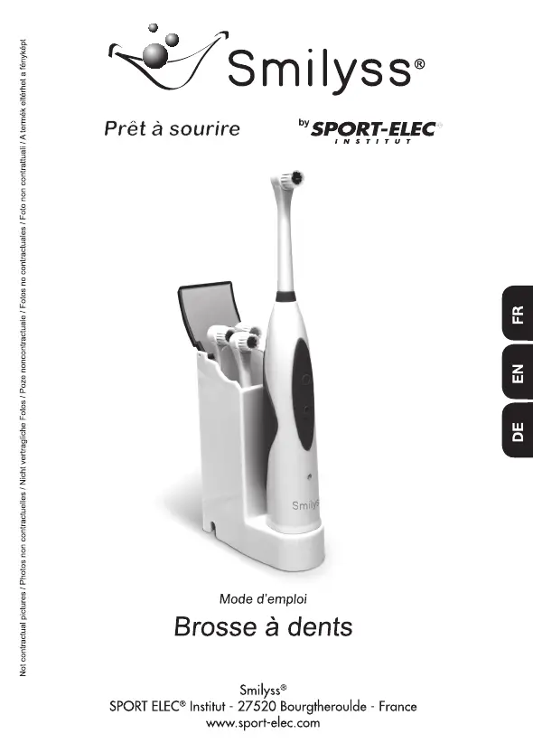 Lies die bedienungsanleitung für Sport-Elec Smilyss KHET010 (8 Seiten) kostenlos online; sie gehört zur Kategorie Zahnbürste. Dieses Handbuch wurde von 60 Personen als hilfreich bewertet und erhielt im Schnitt 4.4 Sterne aus 30.5 Bewertungen. Hast du eine Frage zu Sport-Elec Smilyss KHET010 oder möchtest du andere Nutzer dieses Produkts befragen? Stelle eine Frage