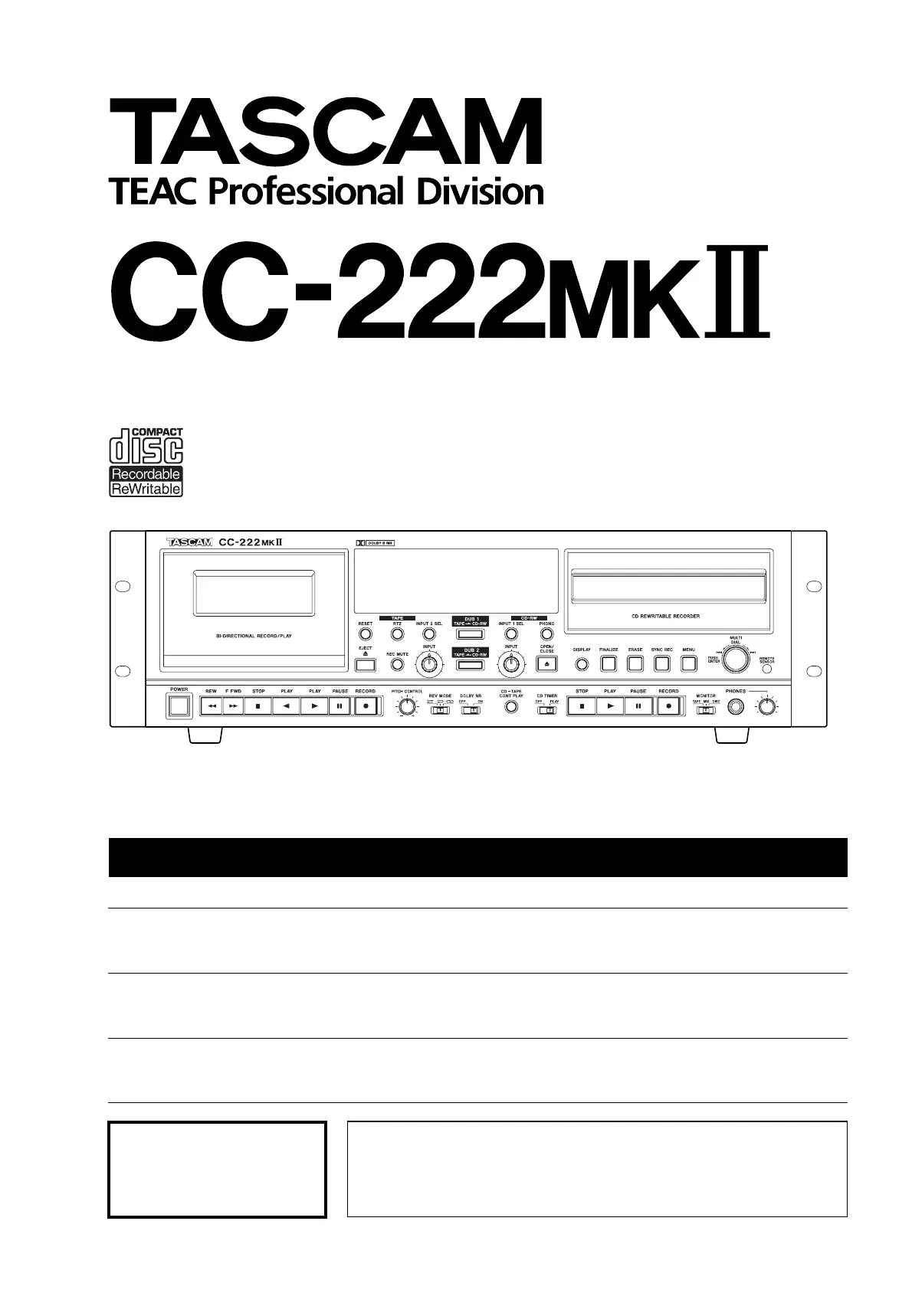 Lies die bedienungsanleitung für Tascam CC-222MKII (42 Seiten) kostenlos online; sie gehört zur Kategorie Audiorecorder. Dieses Handbuch wurde von 3 Personen als hilfreich bewertet und erhielt im Schnitt 4.3 Sterne aus 2 Bewertungen. Hast du eine Frage zu Tascam CC-222MKII oder möchtest du andere Nutzer dieses Produkts befragen? Stelle eine Frage