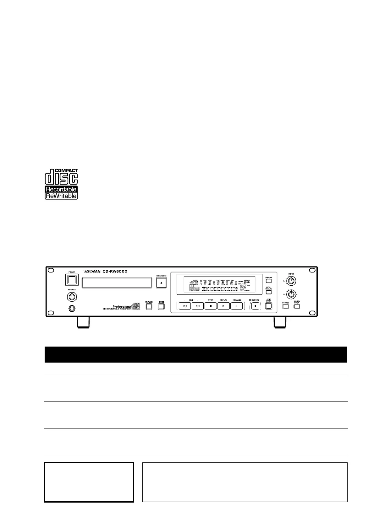 Lies die bedienungsanleitung für Tascam CD-RW5000 (29 Seiten) kostenlos online; sie gehört zur Kategorie Audiorecorder. Dieses Handbuch wurde von 28 Personen als hilfreich bewertet und erhielt im Schnitt 4.9 Sterne aus 14.5 Bewertungen. Hast du eine Frage zu Tascam CD-RW5000 oder möchtest du andere Nutzer dieses Produkts befragen? Stelle eine Frage