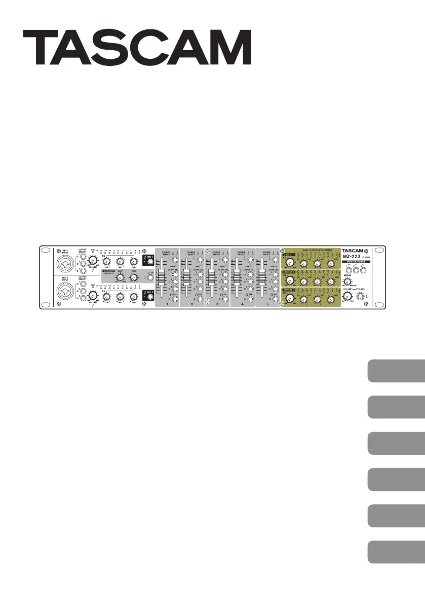Lies die bedienungsanleitung für Tascam MZ-223 (92 Seiten) kostenlos online; sie gehört zur Kategorie Mischer. Dieses Handbuch wurde von 20 Personen als hilfreich bewertet und erhielt im Schnitt 4.4 Sterne aus 10.5 Bewertungen. Hast du eine Frage zu Tascam MZ-223 oder möchtest du andere Nutzer dieses Produkts befragen? Stelle eine Frage