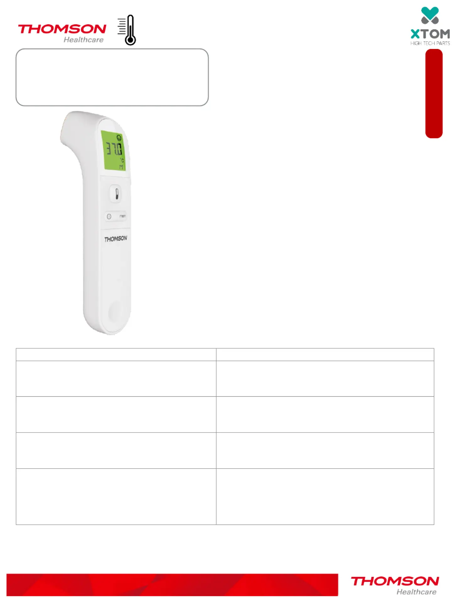 Lies die bedienungsanleitung für Thomson THERMO FH2 (1 Seiten) kostenlos online; sie gehört zur Kategorie Thermometer. Dieses Handbuch wurde von 21 Personen als hilfreich bewertet und erhielt im Schnitt 4.2 Sterne aus 5 Bewertungen. Hast du eine Frage zu Thomson THERMO FH2 oder möchtest du andere Nutzer dieses Produkts befragen? Stelle eine Frage