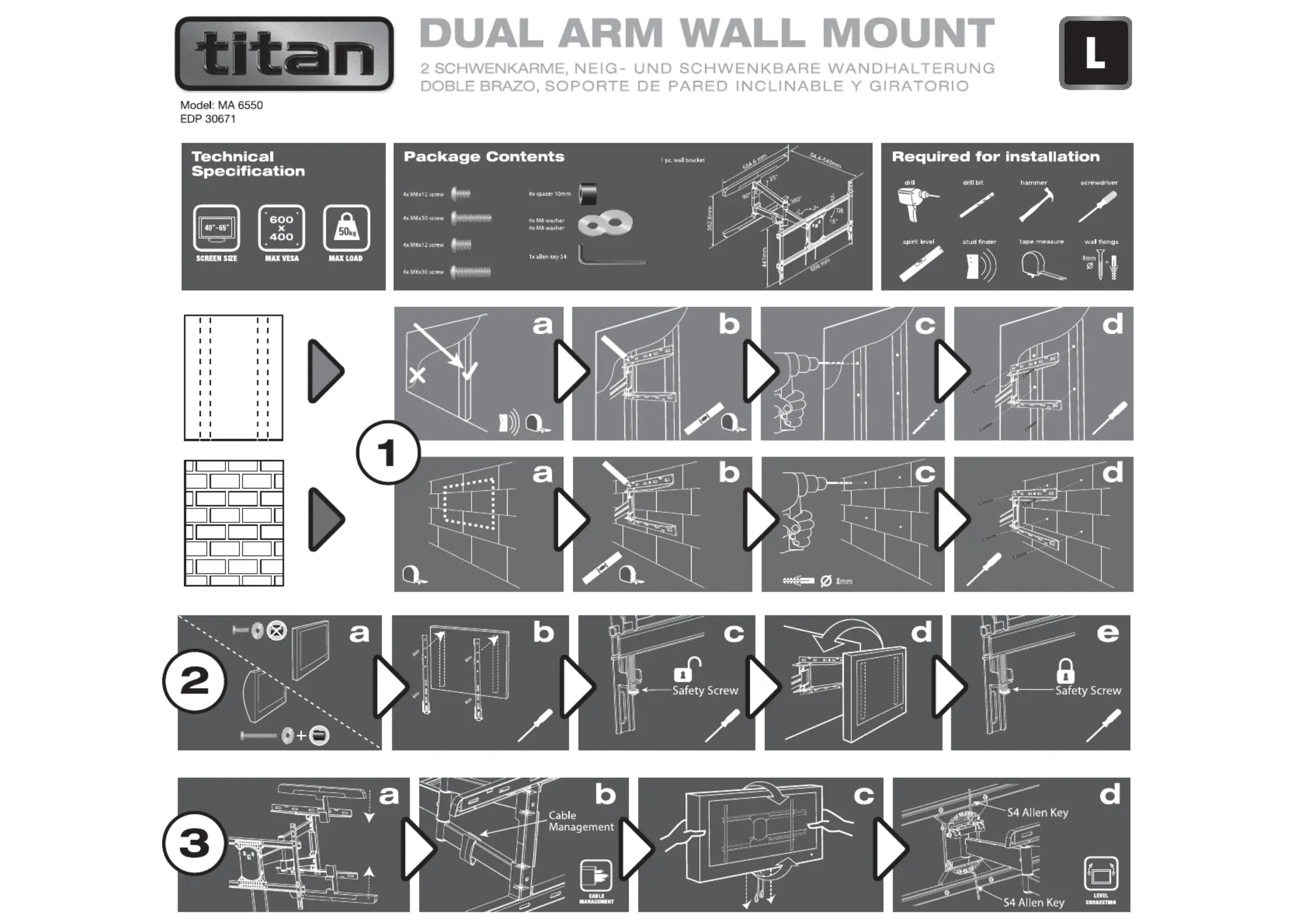 Lies die bedienungsanleitung für Titan MA 6550 (1 Seiten) kostenlos online; sie gehört zur Kategorie Wandstütze. Dieses Handbuch wurde von 12 Personen als hilfreich bewertet und erhielt im Schnitt 3.6 Sterne aus 6.5 Bewertungen. Hast du eine Frage zu Titan MA 6550 oder möchtest du andere Nutzer dieses Produkts befragen? Stelle eine Frage