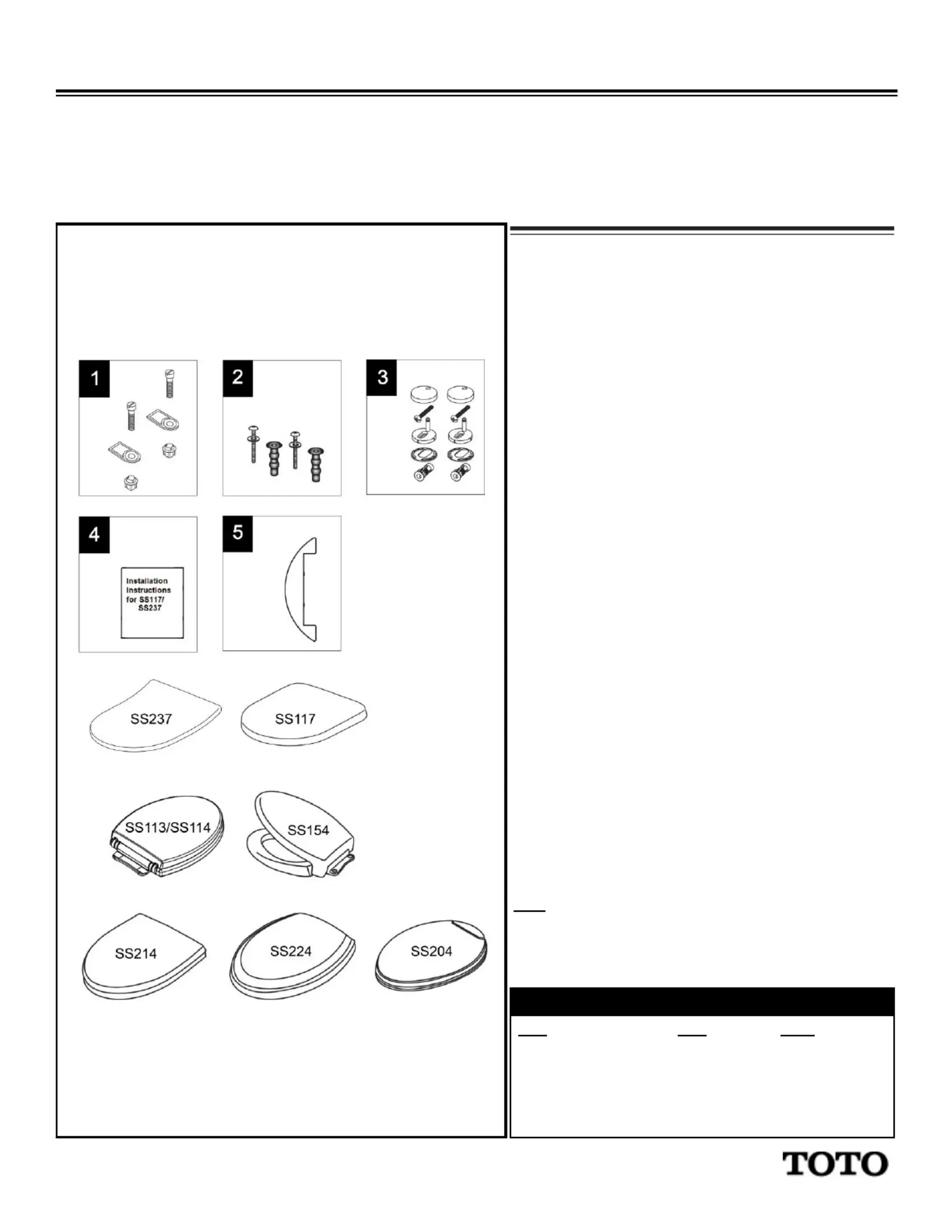Lies die bedienungsanleitung für TOTO SS114 (1 Seiten) kostenlos online; sie gehört zur Kategorie Toilette. Dieses Handbuch wurde von 2 Personen als hilfreich bewertet und erhielt im Schnitt 4.8 Sterne aus 2 Bewertungen. Hast du eine Frage zu TOTO SS114 oder möchtest du andere Nutzer dieses Produkts befragen? Stelle eine Frage