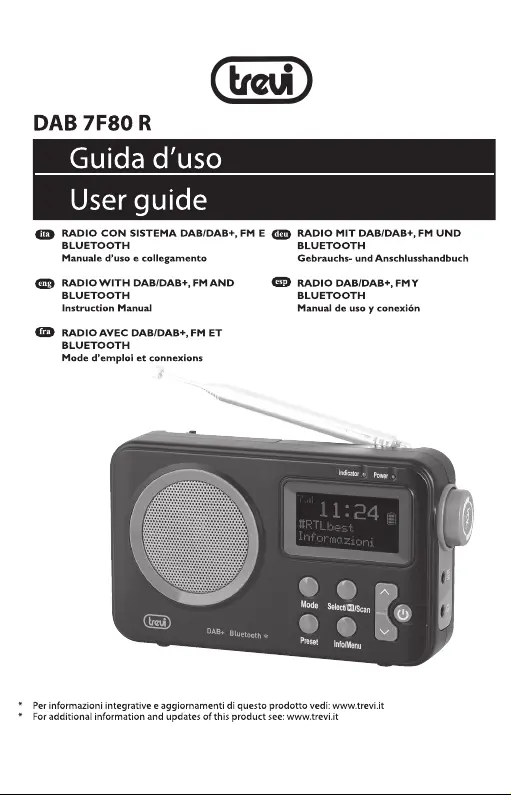 Lies die bedienungsanleitung für Trevi DAB 7F80 R (16 Seiten) kostenlos online; sie gehört zur Kategorie Radio. Dieses Handbuch wurde von 13 Personen als hilfreich bewertet und erhielt im Schnitt 4.4 Sterne aus 7 Bewertungen. Hast du eine Frage zu Trevi DAB 7F80 R oder möchtest du andere Nutzer dieses Produkts befragen? Stelle eine Frage