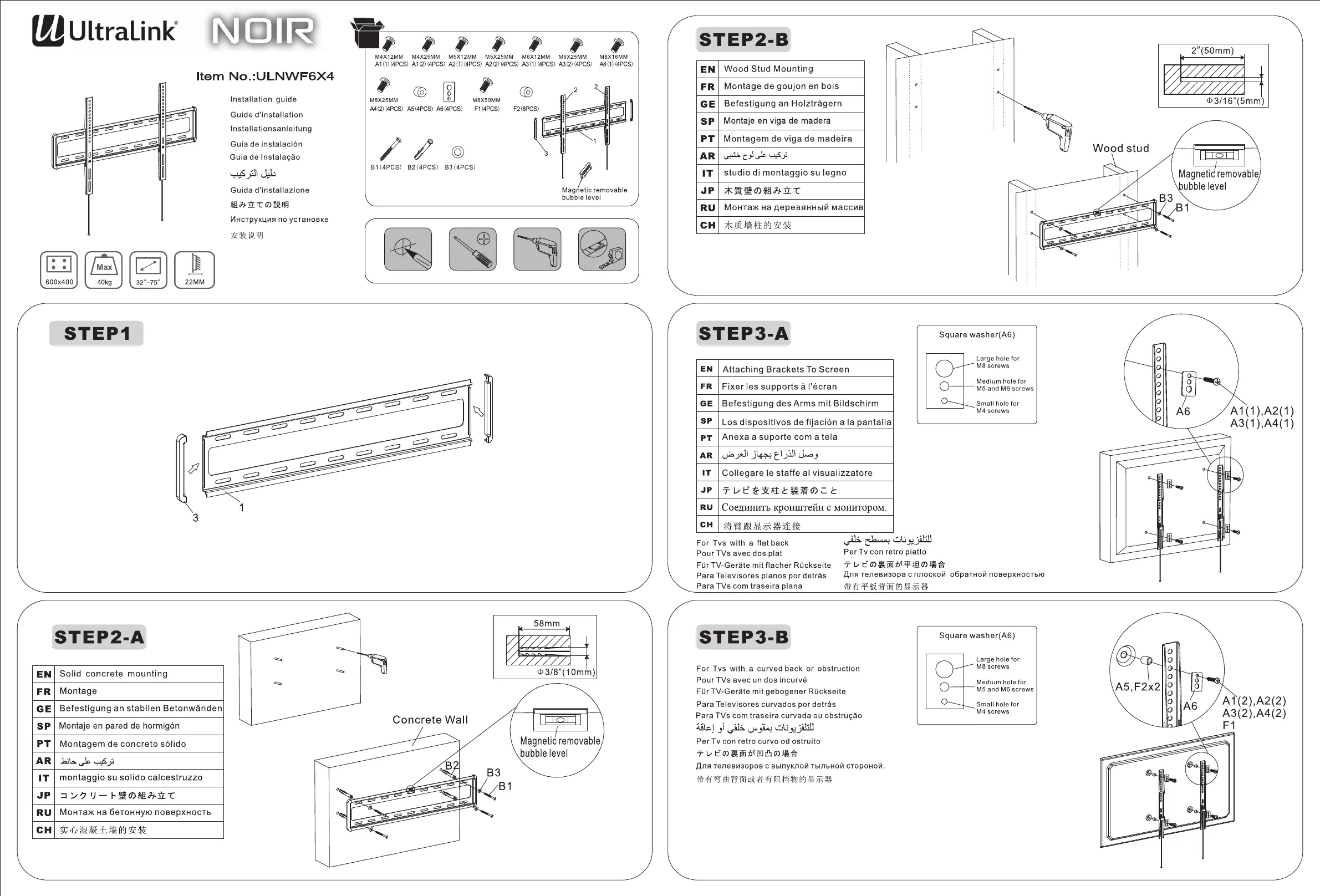 Lies die bedienungsanleitung für UltraLink ULNWF6X4 (2 Seiten) kostenlos online; sie gehört zur Kategorie Flachbildschirmunterstützung. Dieses Handbuch wurde von 12 Personen als hilfreich bewertet und erhielt im Schnitt 4.4 Sterne aus 6.5 Bewertungen. Hast du eine Frage zu UltraLink ULNWF6X4 oder möchtest du andere Nutzer dieses Produkts befragen? Stelle eine Frage