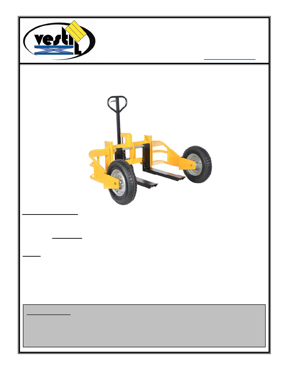 Lies die bedienungsanleitung für Vestil ALL-T-HD (7 Seiten) kostenlos online; sie gehört zur Kategorie Gabelstapler. Dieses Handbuch wurde von 7 Personen als hilfreich bewertet und erhielt im Schnitt 5.0 Sterne aus 4 Bewertungen. Hast du eine Frage zu Vestil ALL-T-HD oder möchtest du andere Nutzer dieses Produkts befragen? Stelle eine Frage