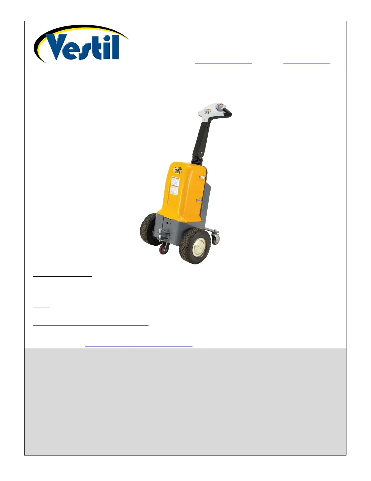 Lies die bedienungsanleitung für Vestil E-TUG-20 (7 Seiten) kostenlos online; sie gehört zur Kategorie Nicht kategorisiert. Dieses Handbuch wurde von 10 Personen als hilfreich bewertet und erhielt im Schnitt 4.9 Sterne aus 5.5 Bewertungen. Hast du eine Frage zu Vestil E-TUG-20 oder möchtest du andere Nutzer dieses Produkts befragen? Stelle eine Frage