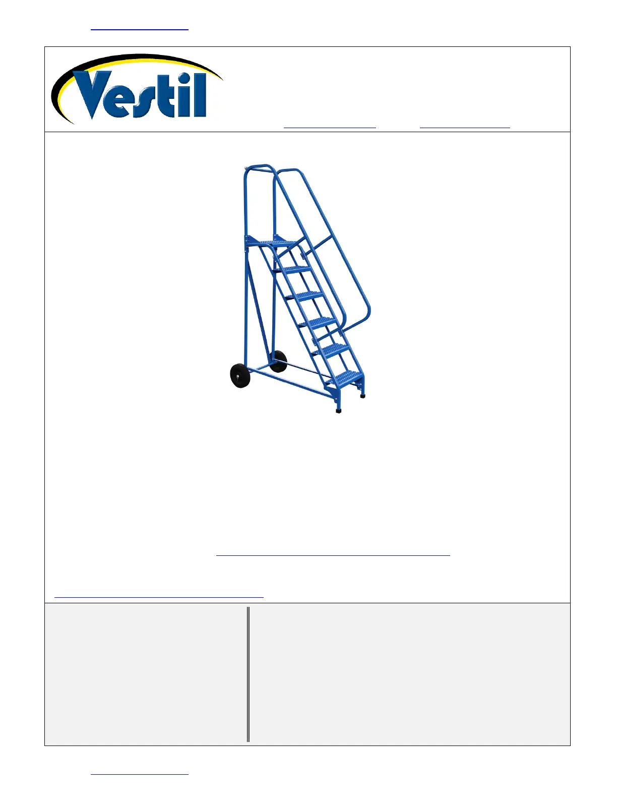 Lies die bedienungsanleitung für Vestil LAD-RAF-11-24-P-EZ (19 Seiten) kostenlos online; sie gehört zur Kategorie Leiter und Gerüst. Dieses Handbuch wurde von 3 Personen als hilfreich bewertet und erhielt im Schnitt 4.8 Sterne aus 2 Bewertungen. Hast du eine Frage zu Vestil LAD-RAF-11-24-P-EZ oder möchtest du andere Nutzer dieses Produkts befragen? Stelle eine Frage