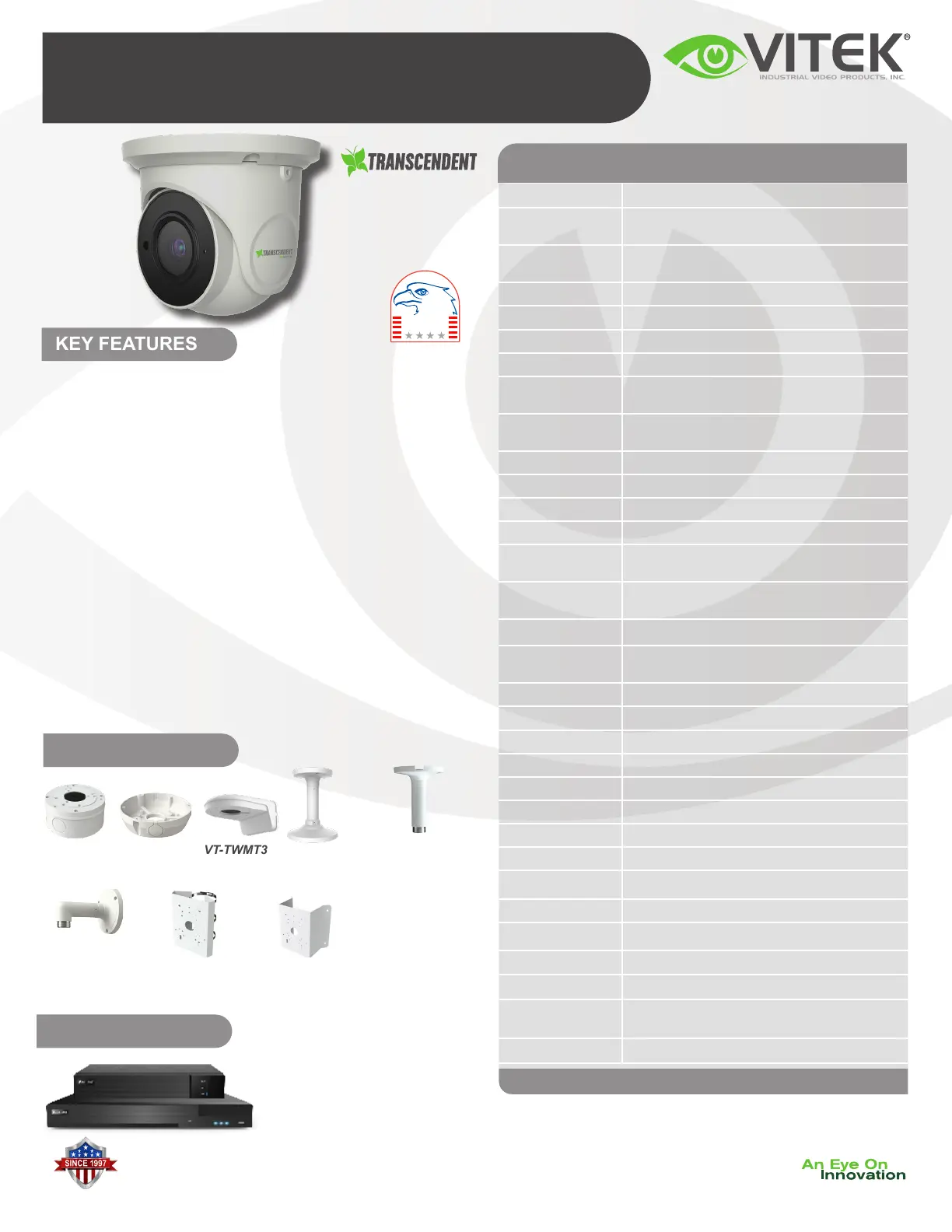 • Optional Junction Boxes (VT-TJB08, VT-TJB01), Wall Mounts (VT-TWMT-3,