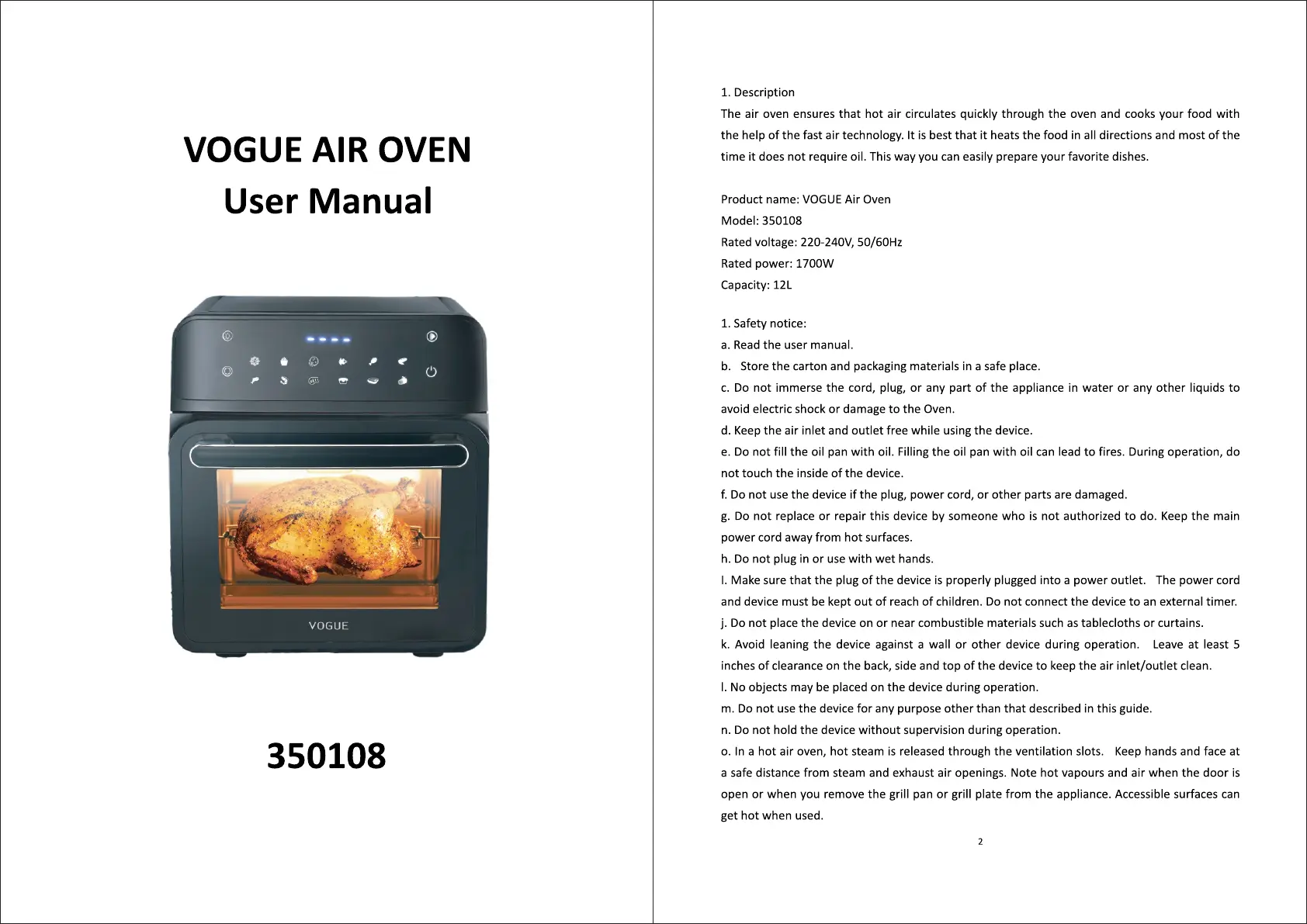 Vogue 350108 Bedienungsanleitung