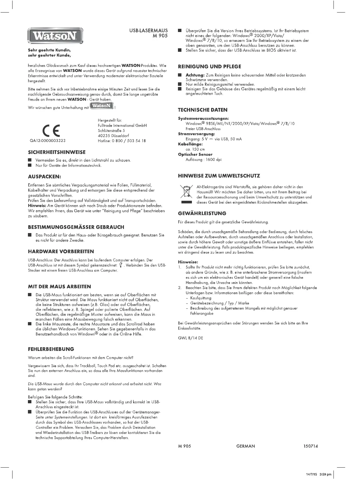 Lies die bedienungsanleitung für Watson M 905 (2 Seiten) kostenlos online; sie gehört zur Kategorie Maus. Dieses Handbuch wurde von 23 Personen als hilfreich bewertet und erhielt im Schnitt 4.3 Sterne aus 12 Bewertungen. Hast du eine Frage zu Watson M 905 oder möchtest du andere Nutzer dieses Produkts befragen? Stelle eine Frage