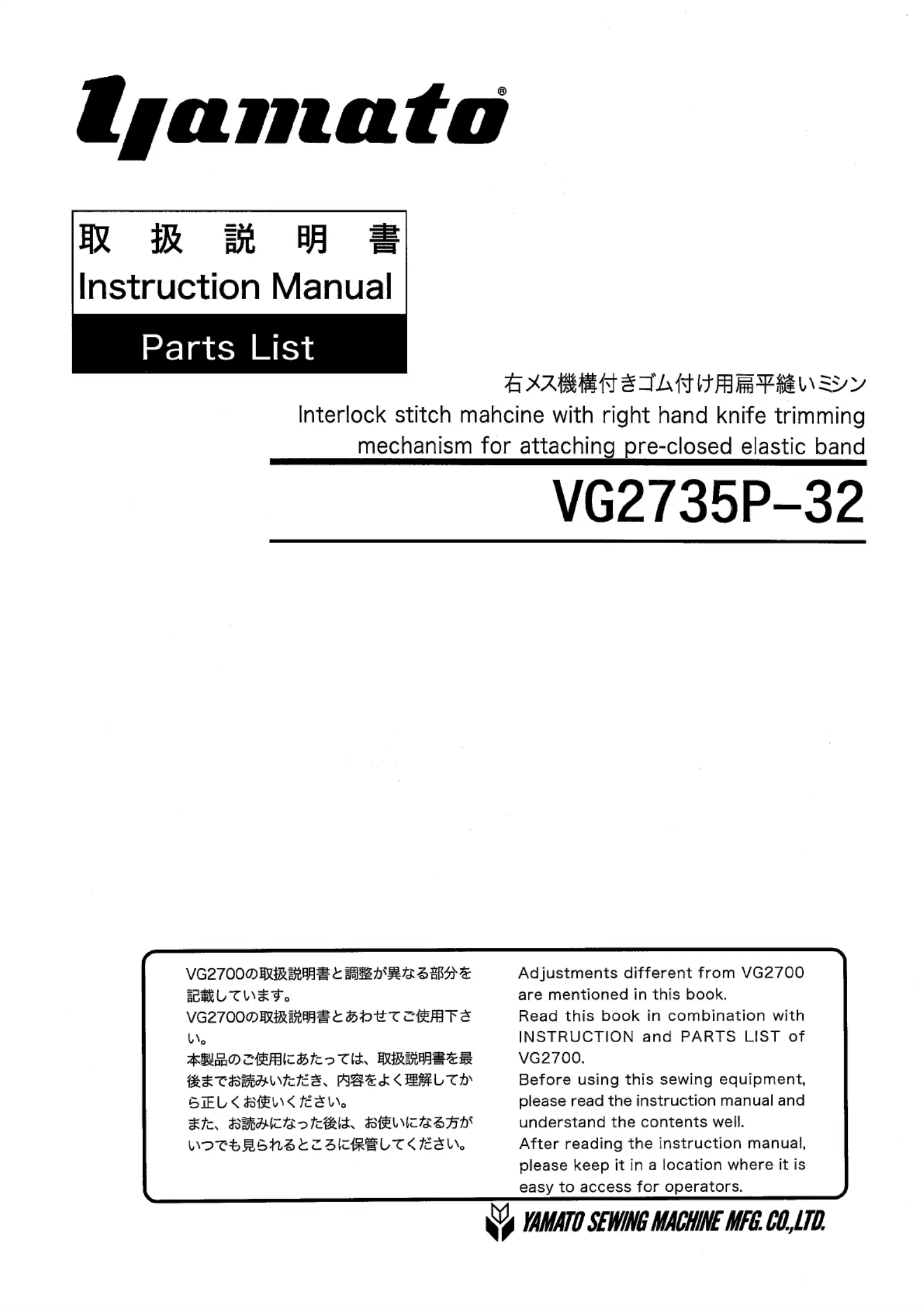Lies die bedienungsanleitung für Yamato VG2735P-32 (40 Seiten) kostenlos online; sie gehört zur Kategorie Nähmaschine. Dieses Handbuch wurde von 41 Personen als hilfreich bewertet und erhielt im Schnitt 5.0 Sterne aus 4 Bewertungen. Hast du eine Frage zu Yamato VG2735P-32 oder möchtest du andere Nutzer dieses Produkts befragen? Stelle eine Frage