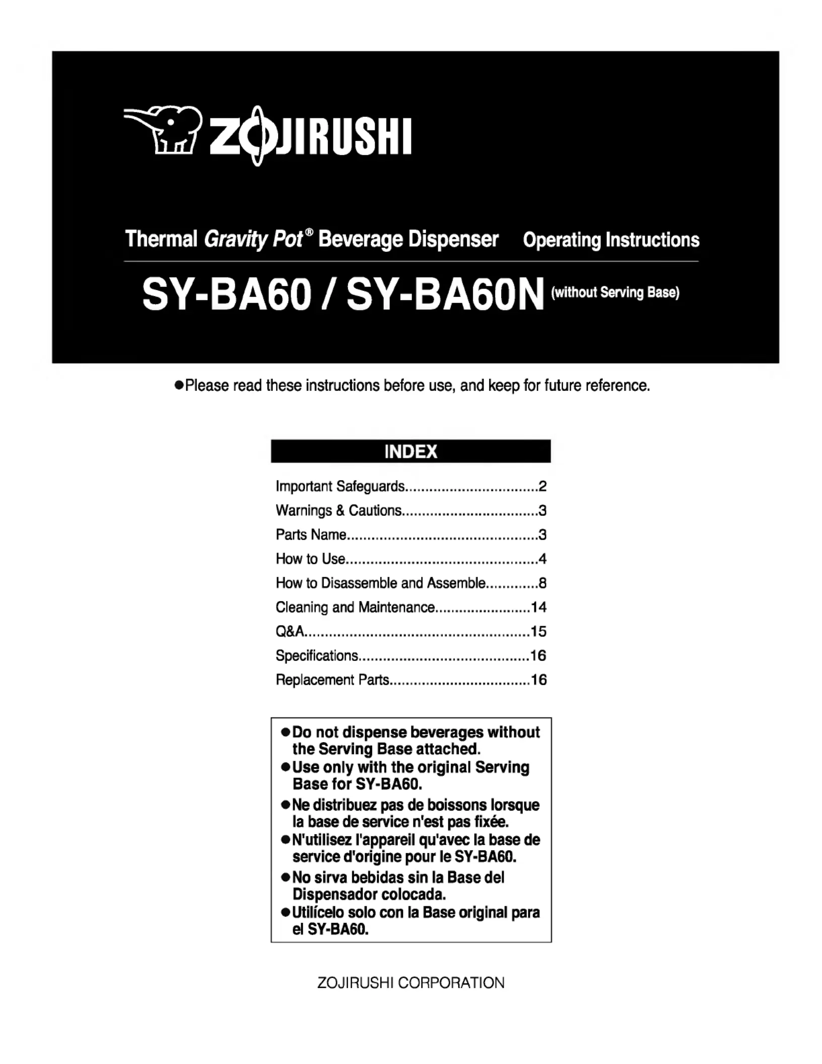 Lies die bedienungsanleitung für Zojirushi SY-BA60N (18 Seiten) kostenlos online; sie gehört zur Kategorie Nicht kategorisiert. Dieses Handbuch wurde von 12 Personen als hilfreich bewertet und erhielt im Schnitt 4.6 Sterne aus 6.5 Bewertungen. Hast du eine Frage zu Zojirushi SY-BA60N oder möchtest du andere Nutzer dieses Produkts befragen? Stelle eine Frage